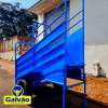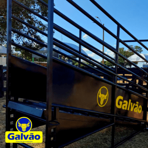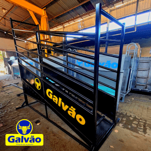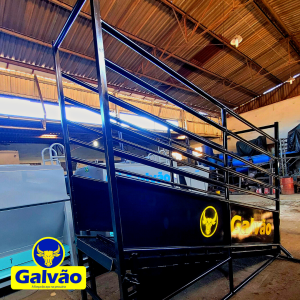 Embarcador de gado móvel, modelo sem rodas, é fabricado com materiais novos, possui estrutura em perfis e tubos em chapa 14, montado na solda mig industrial, com assoalho em chapa zebrada antiderrapante com sistema de degraus para evitar que o gado escorregue ou desça de uma vez. O embarcador também possui sistema de regulagem de altura com cambão para adequação de acordo com a altura de chegada do caminhão.